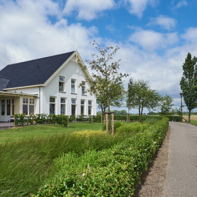 Een verbouwingsplan met een grondige aanpak. De indeling is gewijzigd en de gevels zijn volledig gerestijld. Wit gestucte gevels zwarte planken en oranje rode dakpannen zijn materialen en kleuren passend op deze locatie.